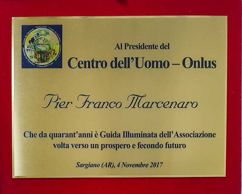 Posteriormente, para sellar tales palabras, entregó al presidente del Centro del Hombre, Pier Franco Marcenaro, la placa conmemorativa de los treinta años.